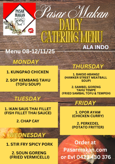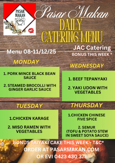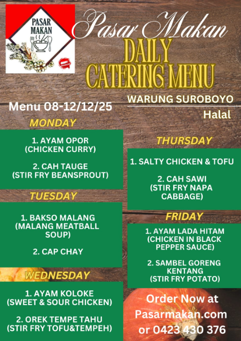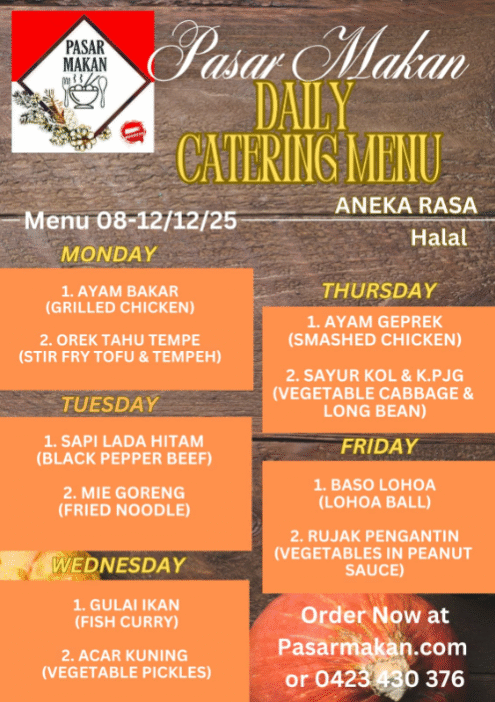!! IMPORTANT TO NOTE: Pasar Makan will put your catering order on AUTO CONTINUE so you don’t have to keep ordering online every week. This is our default mode. All catering will be on AUTO mode UNLESS you inform us before SATURDAY. Any changes please message us on 0423 430 376.